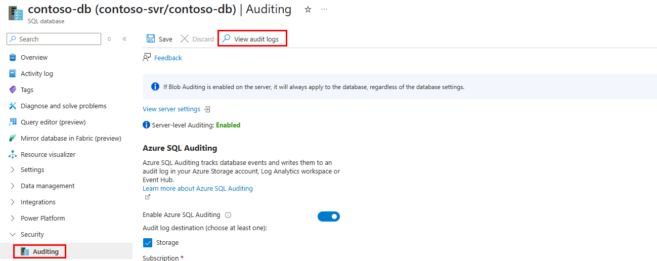 “ 查看审核日志 ”按钮同时显示在服务器级别和数据库级 审核 页上。 从 数据库 资源中选择它时,会看到特定于该数据库的审核记录。 从 服务器 资源中选择它时,会看到该服务器上的所有数据库的审核记录。 请确保根据需要查看的审核日志范围导航到正确的资源级别。