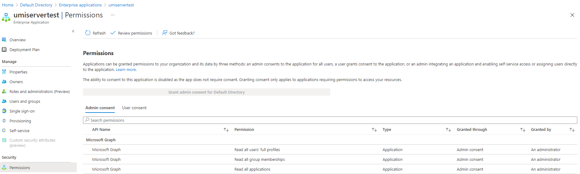 创建 UMI 后,必须授予一些权限,以允许 UMI 从 Microsoft Graph 作为服务器标识进行读取。 授予以下权限,或授予 UMI Directory Readers角色。