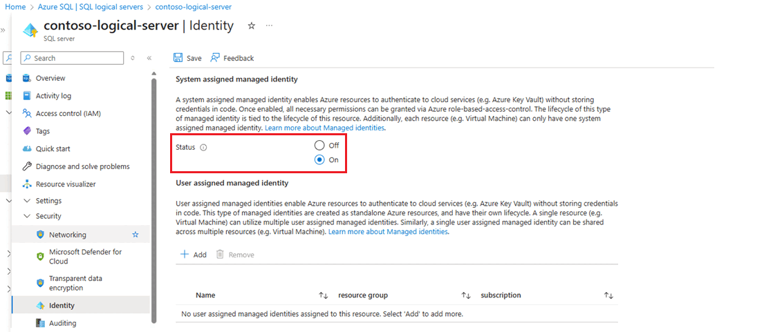 若要在 Azure 门户中为 Azure SQL 数据库逻辑服务器设置系统托管标识,请执行以下步骤: