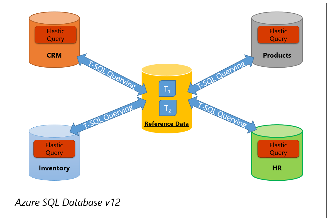 跨数据库查询:弹性查询支持需要在 SQL 数据库中跨多个数据库进行查询的用例。 图 3 显示了四个不同的数据库:CRM、库存、人力资源和产品。 在其中一个数据库中执行的查询还需要访问一个或所有其他数据库。 使用弹性查询时,可以通过在这四个数据库的每个数据库上运行几个简单的 DDL 语句来为此案例配置数据库。 经过此一次性配置后,对远程表的访问就像从 T-SQL 查询或 BI 工具引用本地表一样简单。 如果远程查询不返回大型结果,则建议使用此方法。