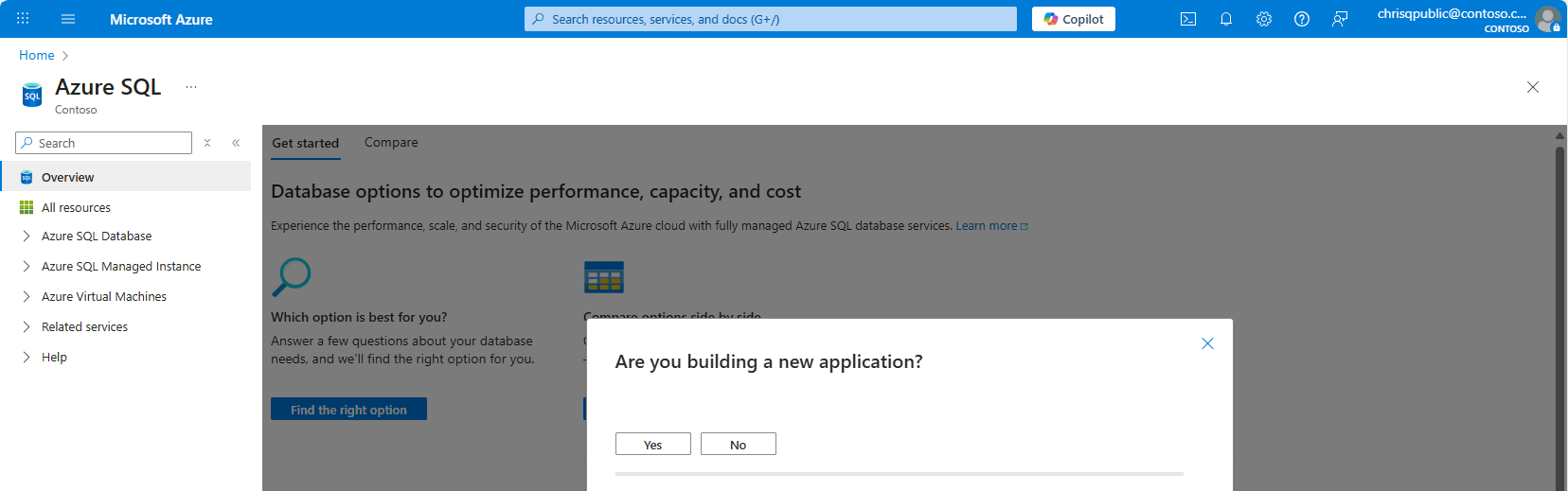 • Azure SQL 中心包括 “查找正确的选项 ”和 “比较选项 ”信息性帮助程序。