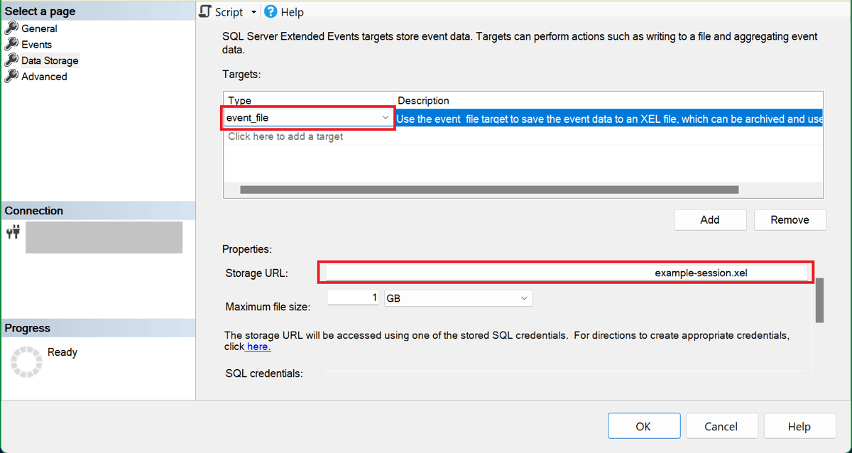 event_file在此 URL 的末尾键入一个正斜杠 (/),后跟文件 (blob) 名称。 在该示例中,blob 名称为example-session.xel,整个 URL 为https://<storage-account-name>.blob.core.chinacloudapi.cn/<container-name>/example-session.xel。注意