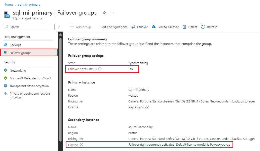 In Failover groups, be sure that Failover rights status is set to ON and that the license model for the secondary instance is Failover rights currently activated.