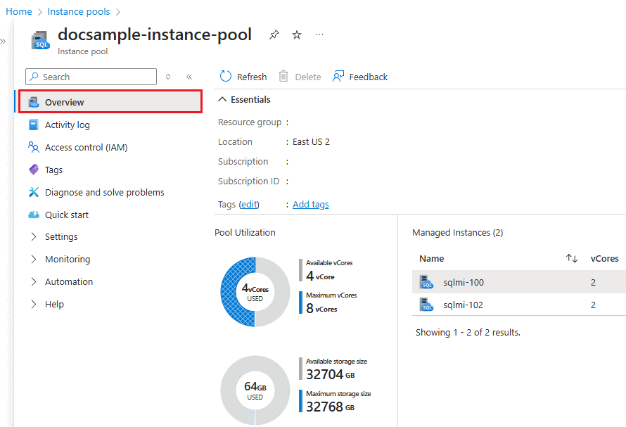 若要获取池中的实例列表,请使用 Azure 门户查看实例池页。 选择池名称,在概述页上查看池中的实例: