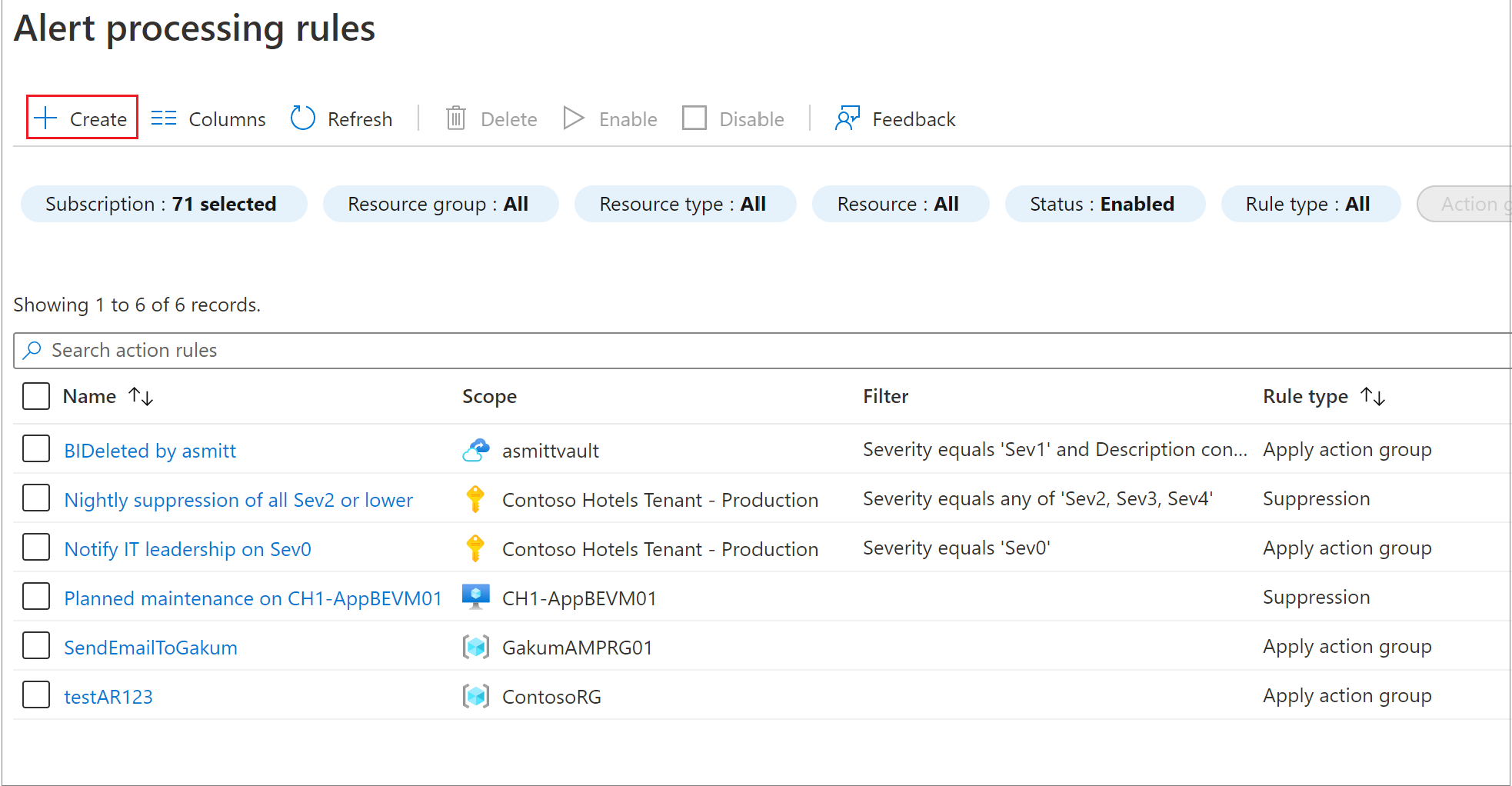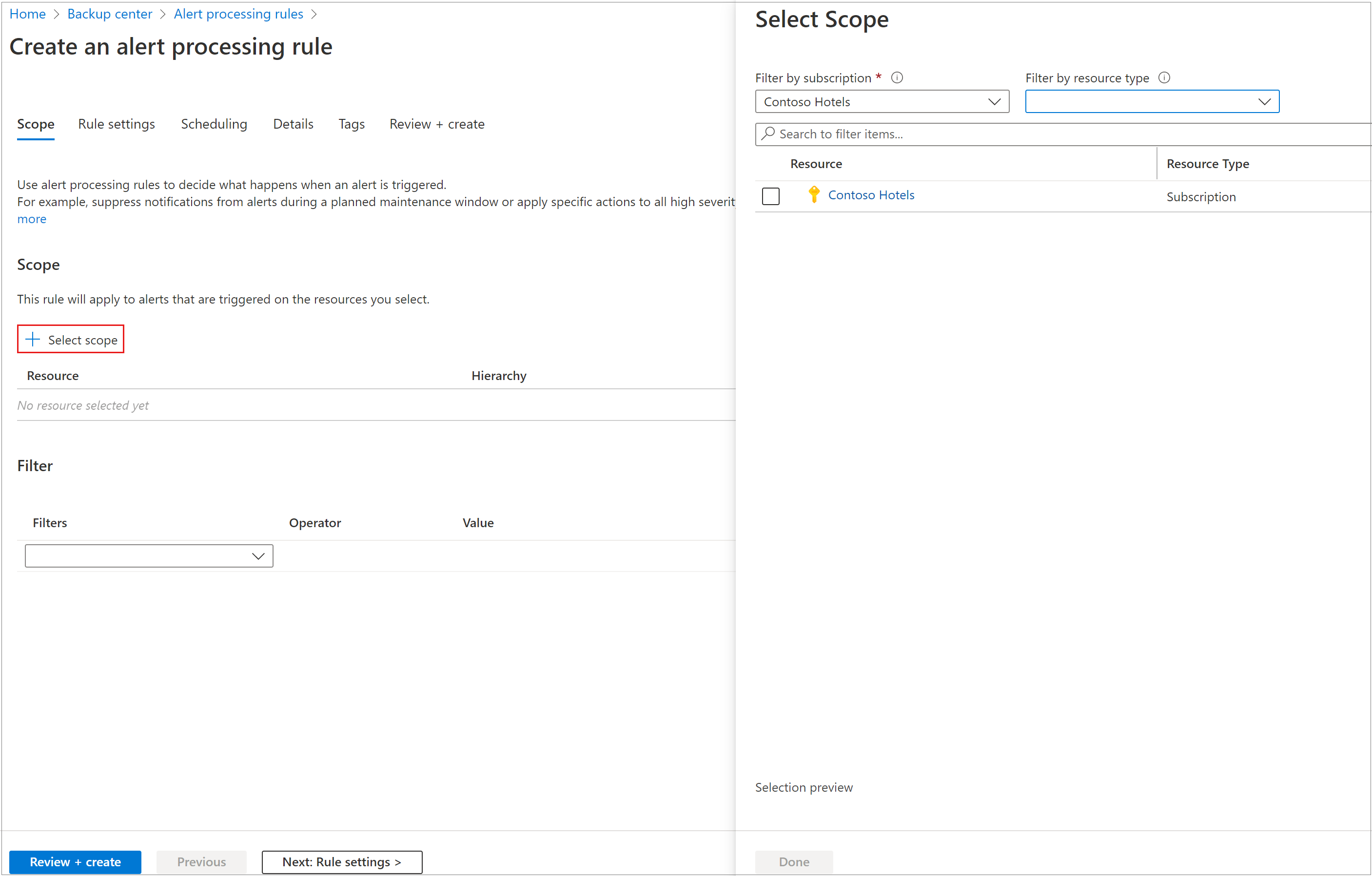 可以针对订阅内的所有资源应用该规则。 还可以选择性地对警报应用筛选器,例如,仅针对特定严重性的警报生成通知。