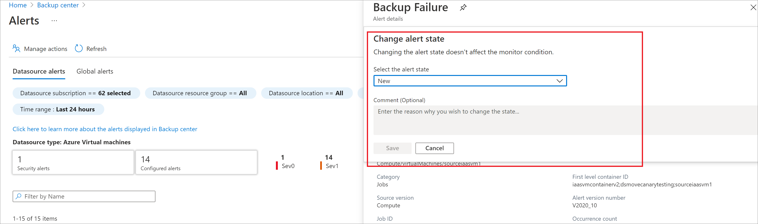 - 数据源警报:与正在备份的特定数据源关联的警报(例如,VM 备份或还原失败、删除数据库备份数据等)显示在“数据源警报”部分下。