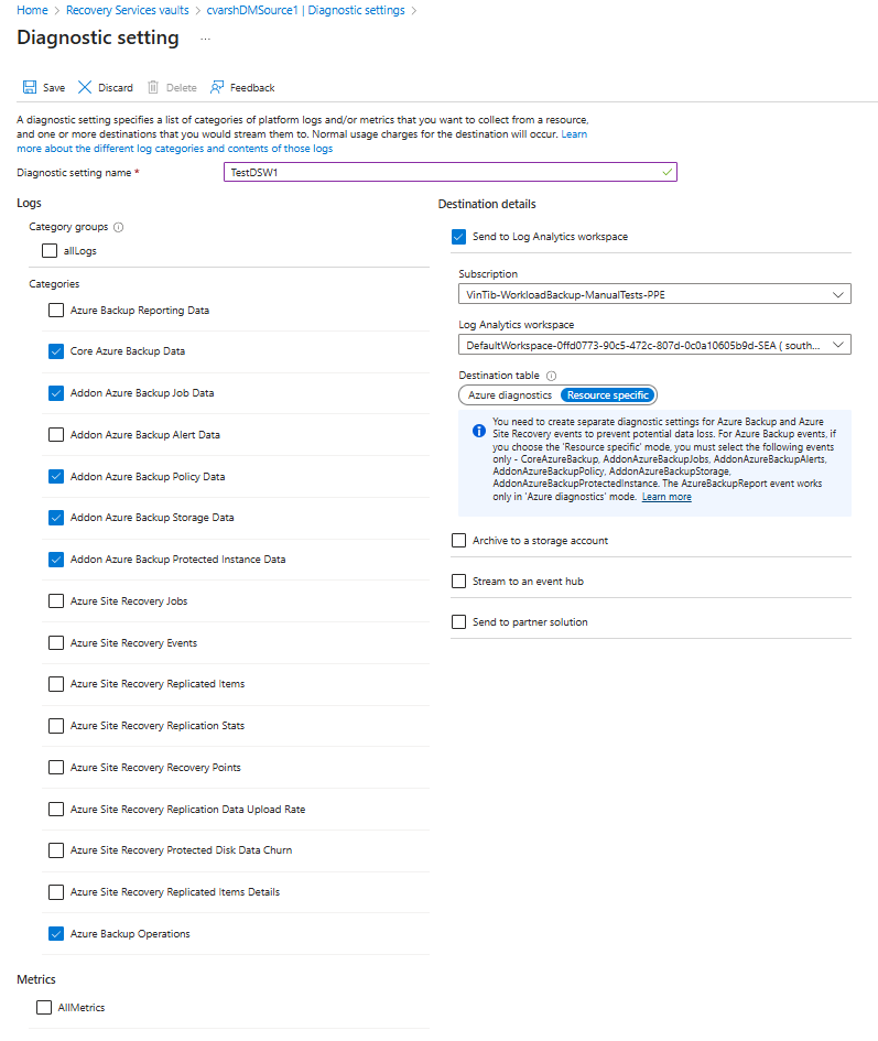 在“恢复服务保管库”的“监视”部分,选择“诊断设置”并指定恢复服务保管库的诊断数据的目标。 若要了解有关使用诊断事件的详细信息,请参阅对恢复服务保管库使用诊断设置。