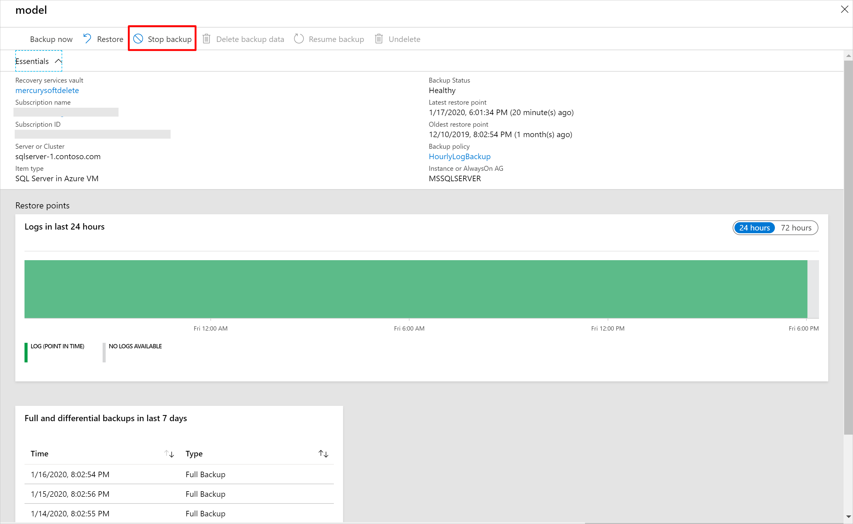 若要删除 SQL Server 中数据库的备份数据,必须停止备份。 在 Azure 门户中,转到恢复服务保管库,转到备份项,然后选择“停止备份”。