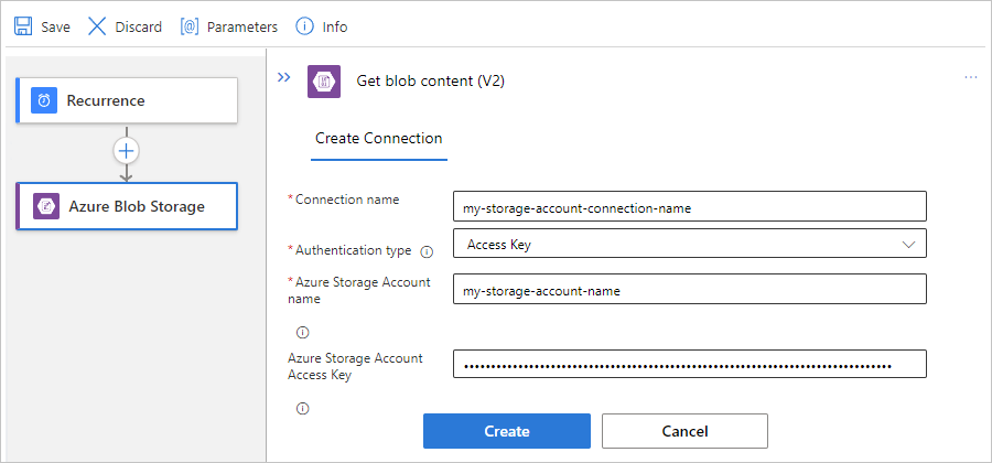 属性 必选 说明 连接名称 是 连接的名称。 身份验证类型 是 存储帐户的身份验证类型。 有关详细信息,请查看 支持身份验证的触发器和操作的身份验证类型。 例如,此连接使用 访问密钥 身份验证,并提供存储帐户的访问密钥值以及以下属性值: