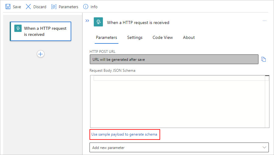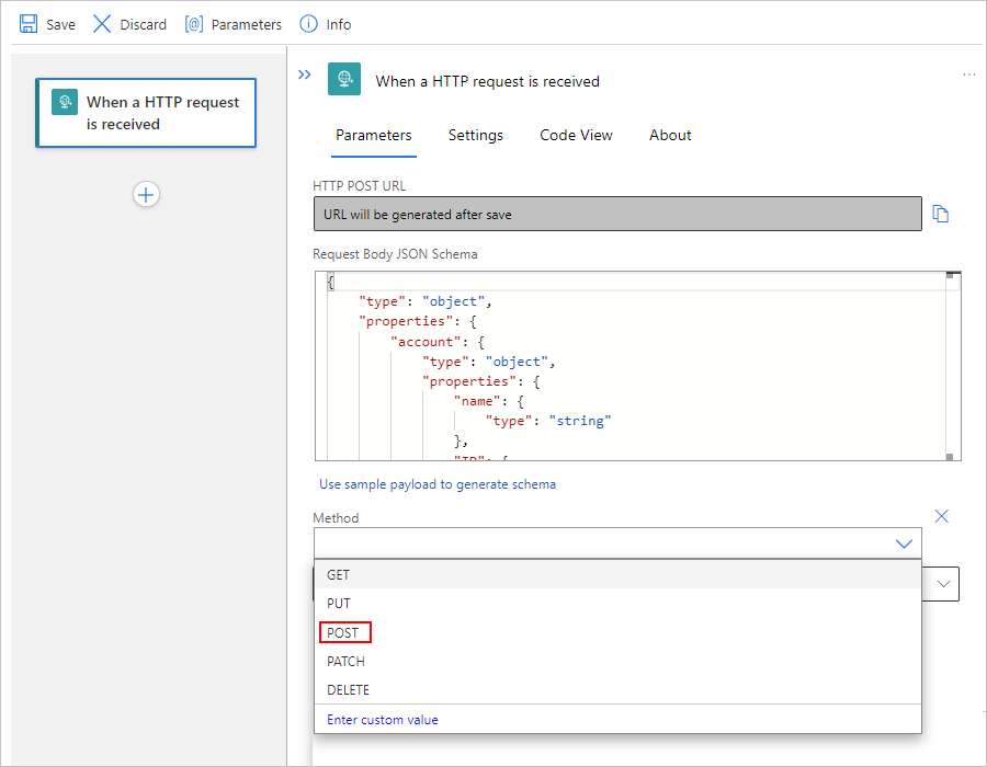 No JSON 架构,用于描述传入请求正文中的属性和值。 设计器将使用此架构为请求中的属性生成标记。 这样一来,工作流就可以分析、使用“请求”触发器中的输出,并将其传递到工作流中。