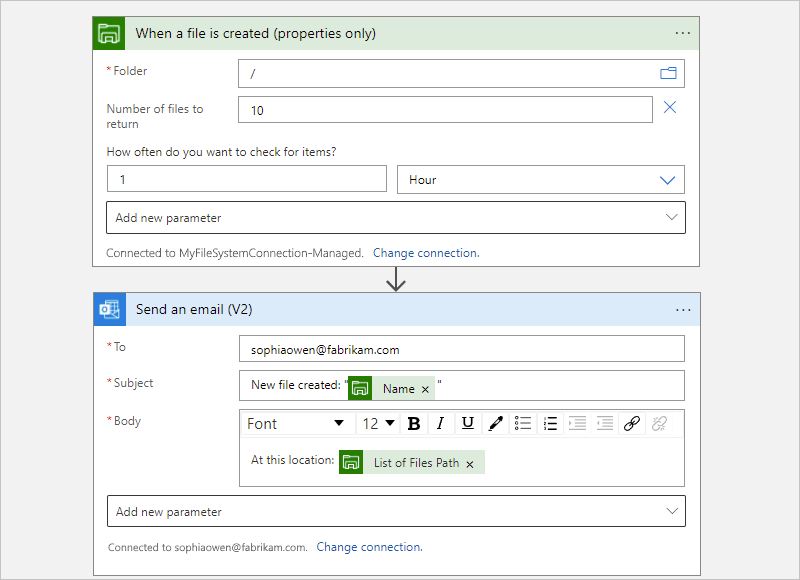 - 在创建文件或将文件添加到文件共享时触发工作流,然后发送一封电子邮件。