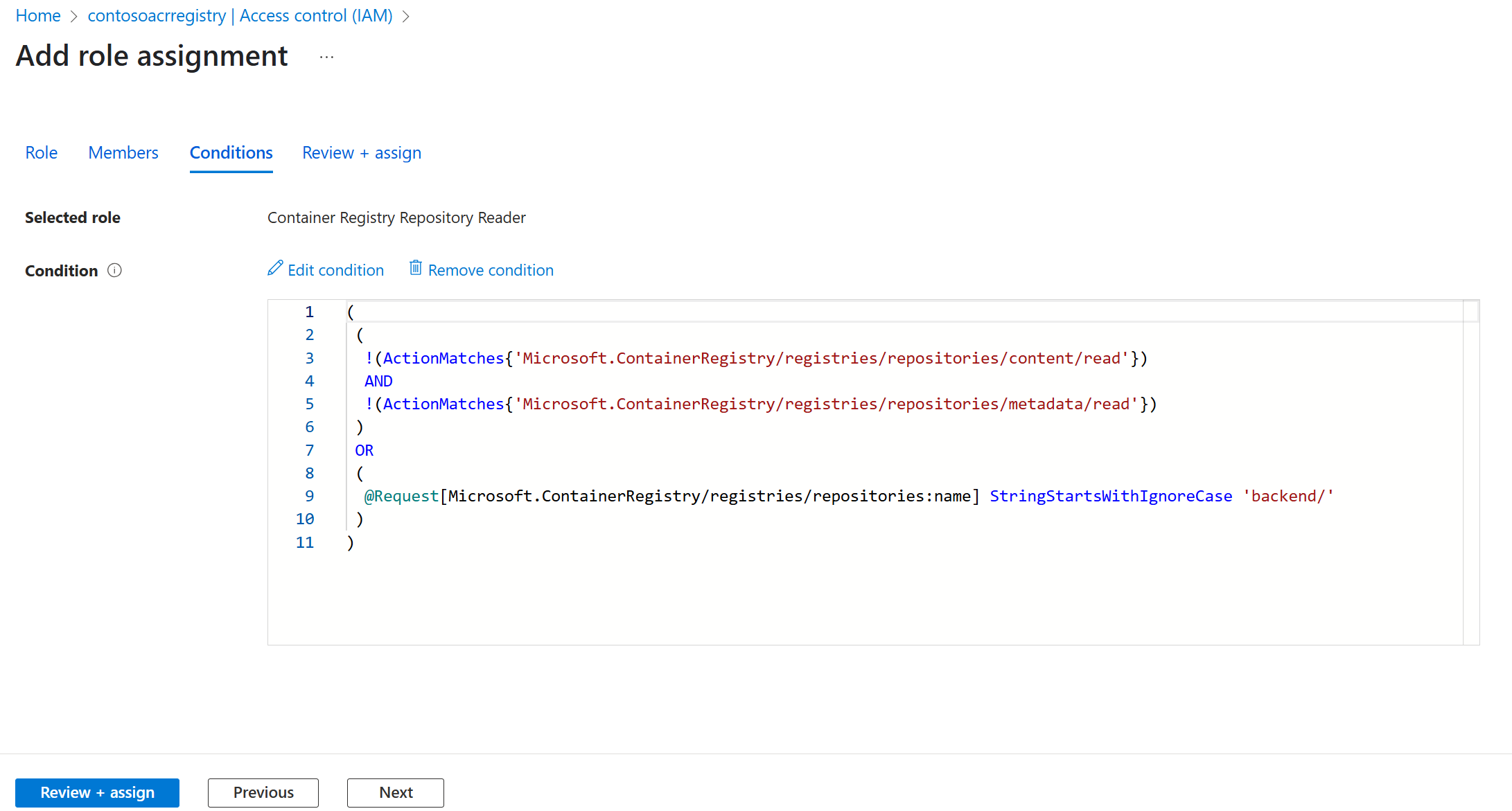 "condition": "( ( !(ActionMatches{'Microsoft.ContainerRegistry/registries/repositories/content/read'}) AND !(ActionMatches{'Microsoft.ContainerRegistry/registries/repositories/metadata/read'}) ) OR ( @Request[Microsoft.ContainerRegistry/registries/repositories:name] StringStartsWithIgnoreCase 'backend/' ))",