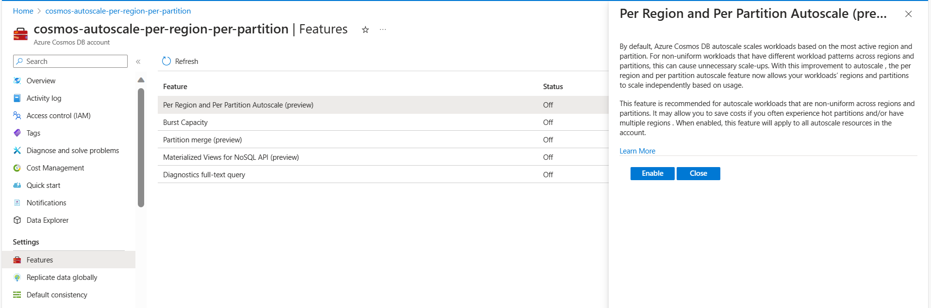 默认情况下,为在 2024 年 9 月 25 日之后创建的所有 Azure Cosmos DB 帐户启用动态缩放。 想要为其旧帐户启用此功能的客户可以通过 Azure PowerShell、CLI、REST API 或 Azure 门户的功能窗格 以编程方式 执行此作,如下所示: