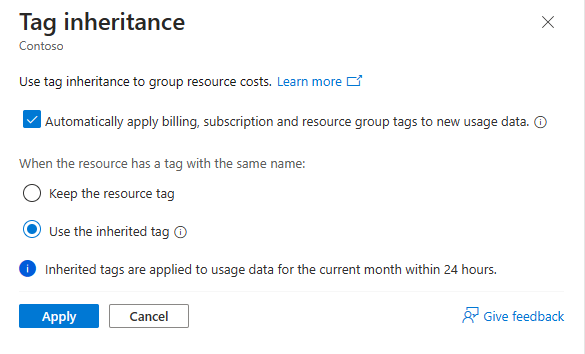 - 在“标记继承”窗口中,选择“自动将计费、订阅和资源组标记应用于新的使用情况数据”。
