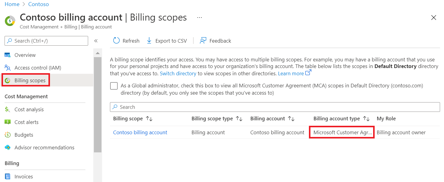 如果有权访问多个计费范围,请检查“计费帐户”列中的类型。 如果任何范围的计费帐户类型为“Microsoft 客户协议” ,则有权访问 Microsoft 客户协议的计费帐户。