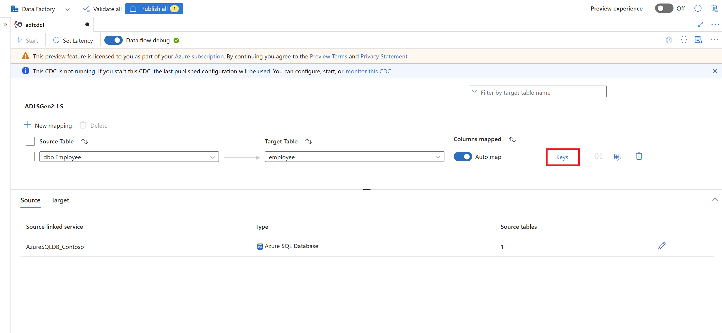 仅当“自动映射”开关处于打开状态时,架构演变才有效。 若要了解如何编辑列映射或包含转换,请参阅使用变更数据捕获资源捕获已更改的数据。