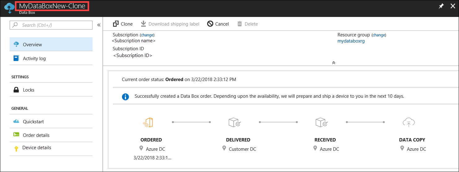 克隆操作在某些情况下很有用。 例如,用户已使用 Data Box 磁盘传输了一些数据。 随着生成的数据越来越多,需要使用更多的磁盘将这些数据传输到 Azure。 在这种情况下,只需克隆同一份订单即可。