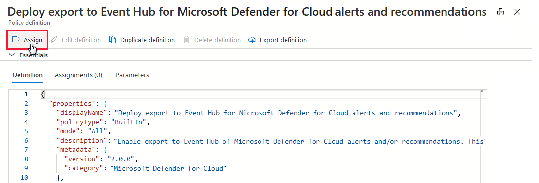 目标 Policy 策略 ID 连续导出到事件中心 将导出到事件中心以Microsoft Defender for Cloud 警报和建议 cdfcce10-4578-4ecd-9703-530938e4abcb 将内容连续导出到 Log Analytics 工作区 将导出部署到 Microsoft Defender for Cloud 警报和建议的 Log Analytics 工作区 ffb6f416-7bd2-4488-8828-56585fef2be9 选择分配。
