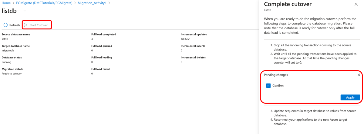 ,确保源数据库的所有传入事务都已停止,选中“确认”复选框,然后选择“应用”。当数据库迁移状态显示“已完成”时重新创建序列(如适用),并将应用程序连接到 Azure Database for PostgreSQL 的新目标实例。