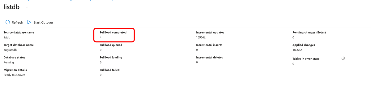 完成迁移后,请在“数据库名称”下选择特定数据库即可转到“完整数据加载”和“增量数据同步”操作的迁移状态 。