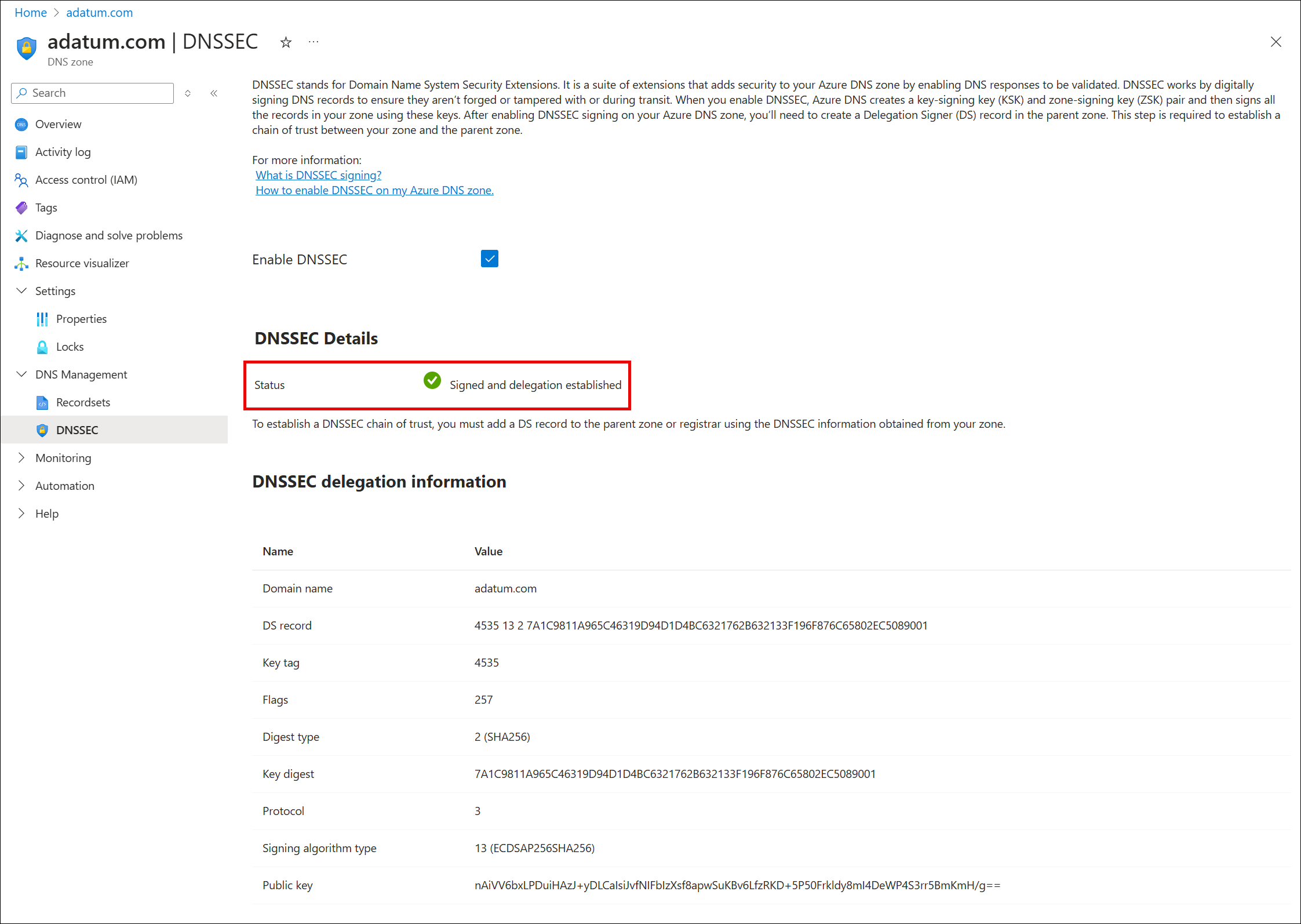 New-AzDnsDnssecConfig -ResourceGroupName "your-resource-group" -ZoneName "adatum.com"