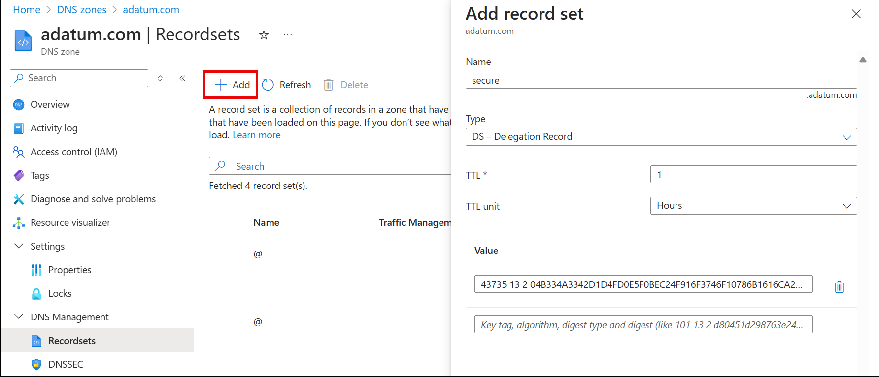 如果你拥有父区域,可直接将 DS 记录添加到父区域。 以下示例演示如何将 DS 记录添加到子区域 secure.adatum.com 的 DNS 区域 adatum.com(在这两个区域都使用 Azure 公共 DNS 进行托管时):