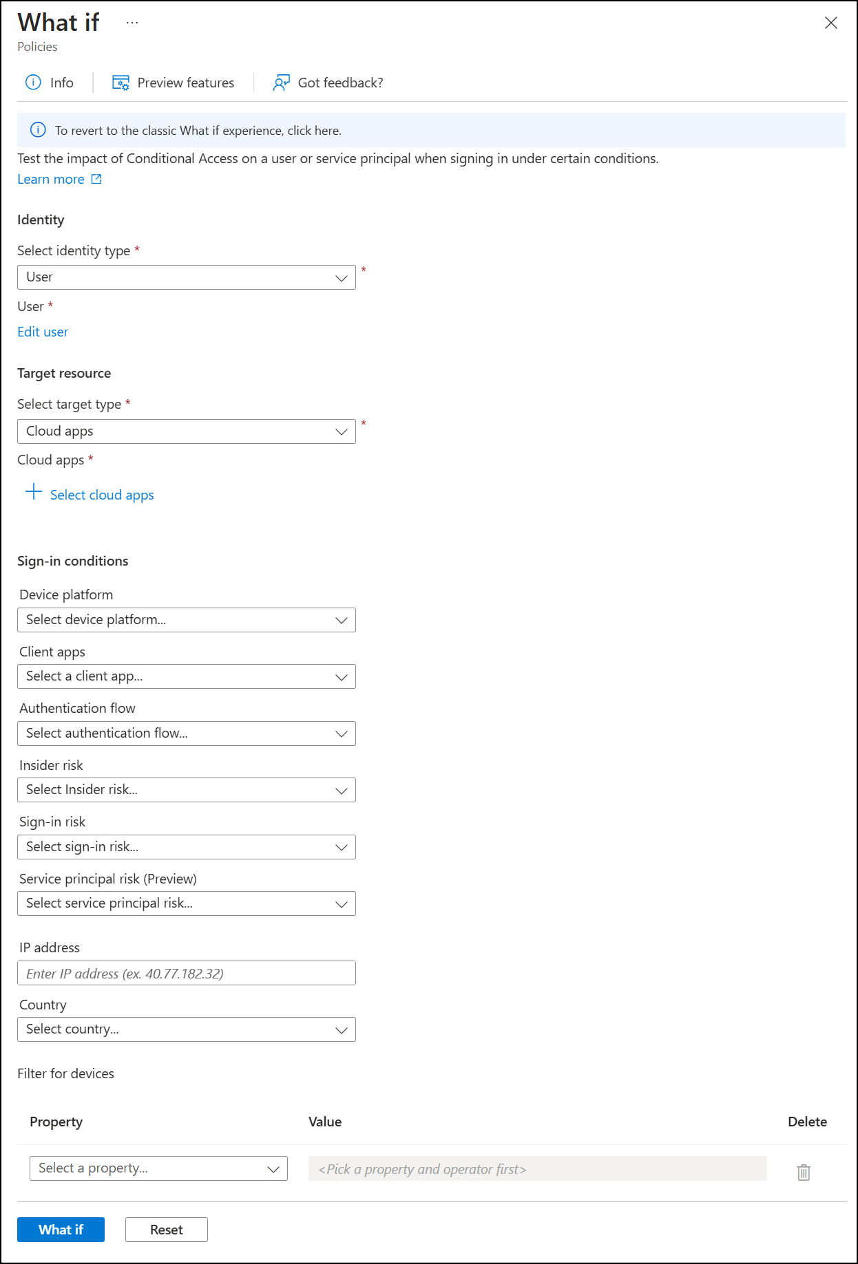 条件访问 What If 工具由 What If 评估 API 提供支持。 若要使用该工具,请先配置要模拟的登录方案的条件。 配置应包括: