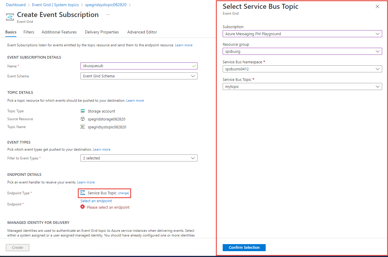 在 Azure 门户中,请在创建事件订阅时选择“服务总线主题”作为终结点类型,然后单击“选择终结点”以选择服务总线主题。