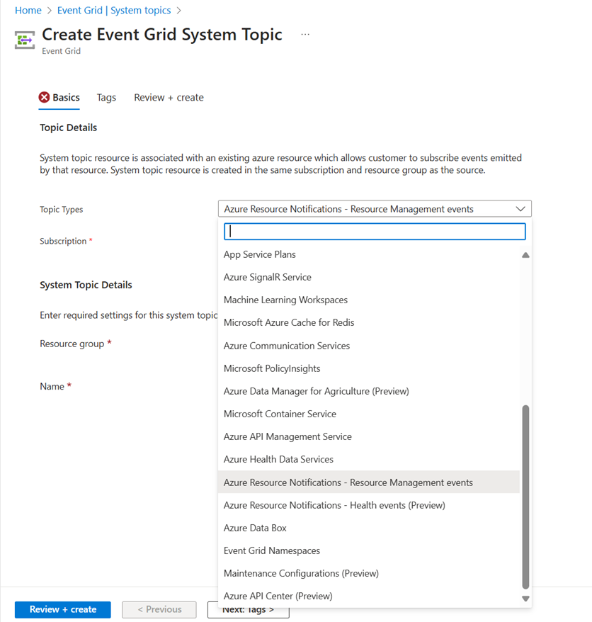 本部分介绍如何创建 microsoft.resourcenotifications.resources 类型的系统主题。