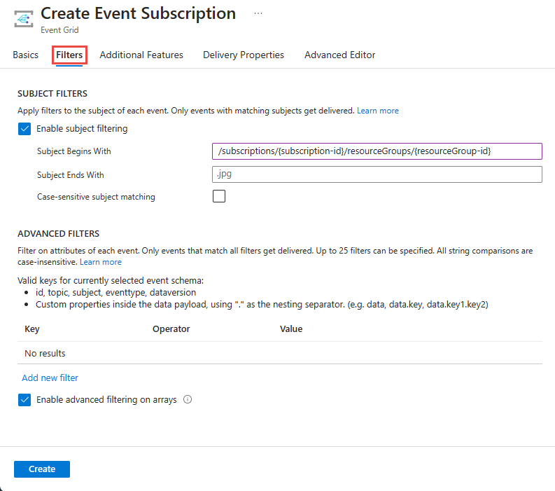 针对在 Azure 订阅中订阅有关虚拟机创建、更新和删除的通知,本部分显示了筛选示例。