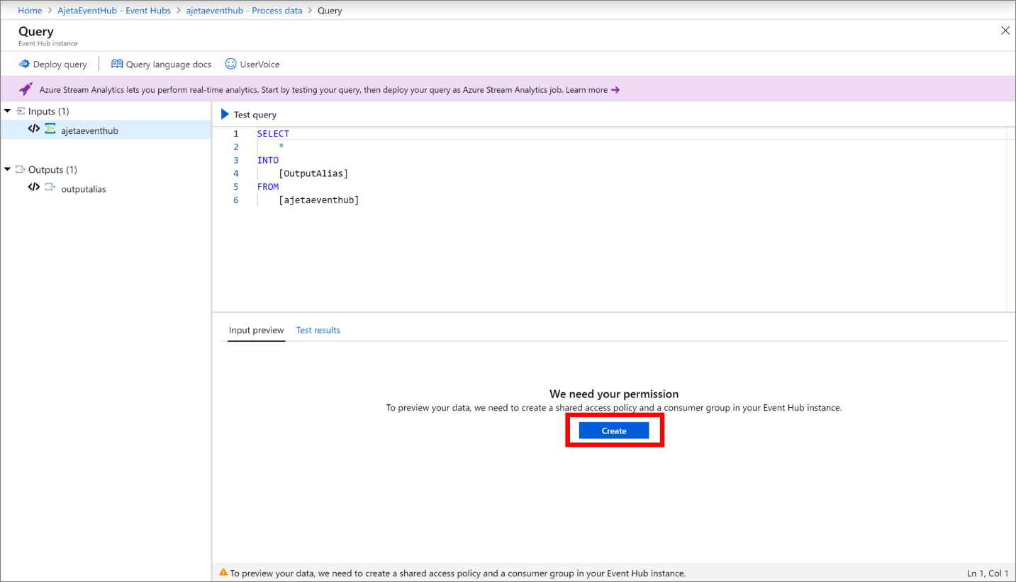 选项 3:用户可以创建 Azure 流分析作业。 将输入设置为此事件中心并导航到“查询”以预览来自此事件中心的传入数据。