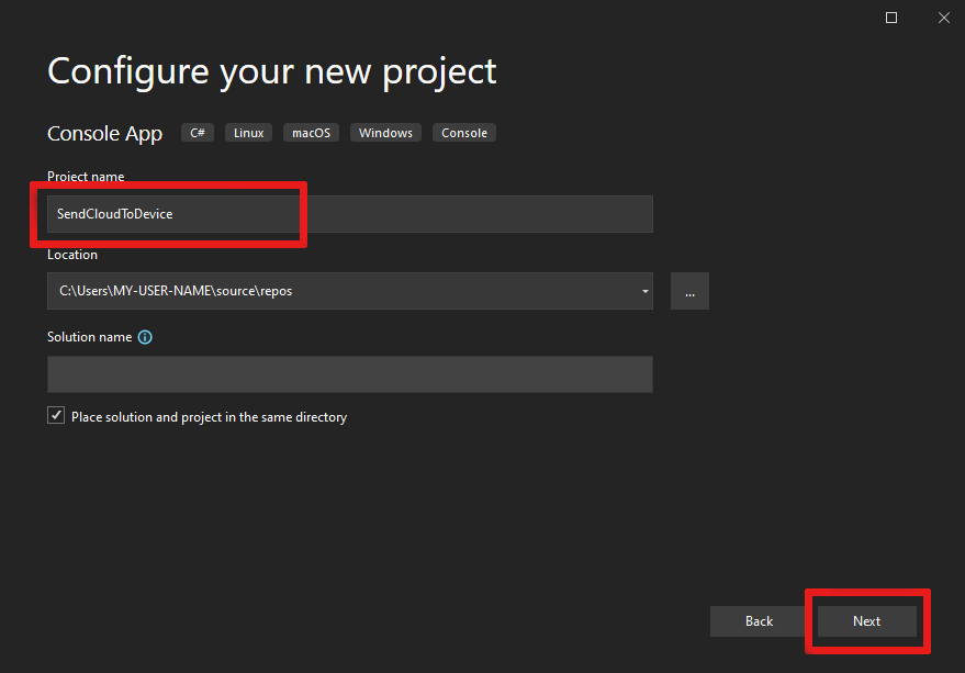 将项目命名为 SendCloudToDevice,然后选择“下一步”。