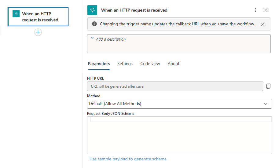 此示例继续使用名为“收到 HTTP 请求时”的请求触发器,例如: