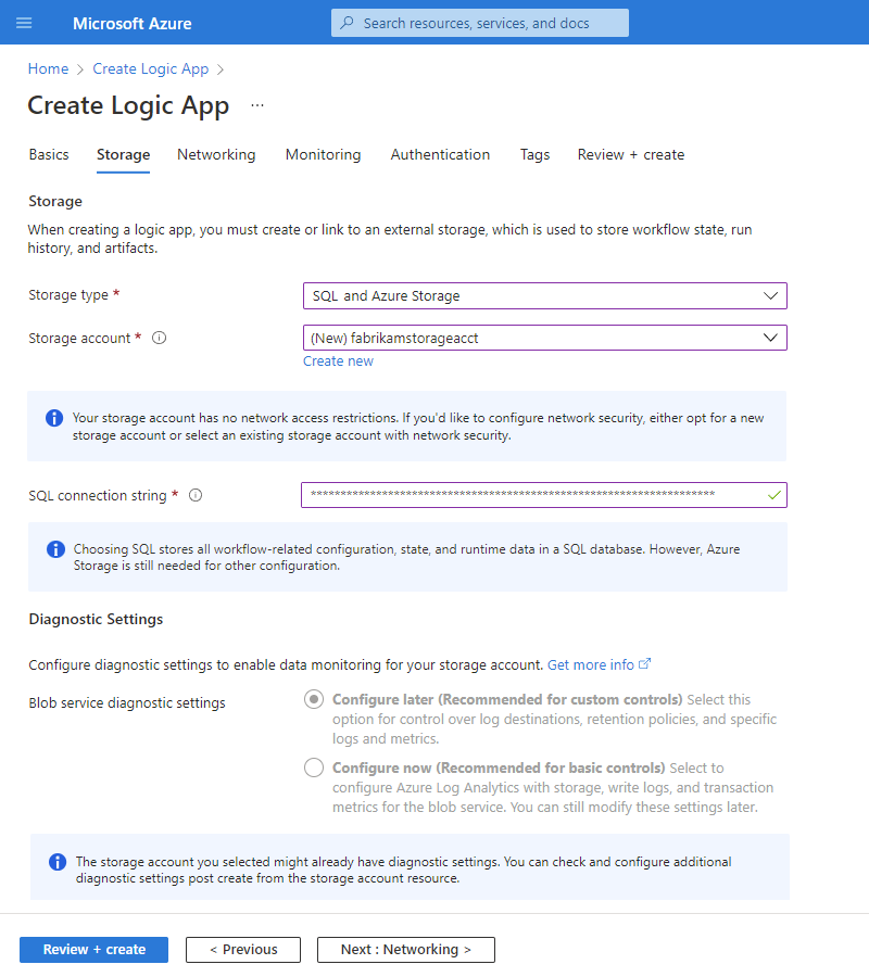 此选项仅对 Azure 部署是必需的。 在 Azure 中,Azure 存储需要在 Azure 逻辑应用平台上完成逻辑应用配置的一次性托管。 进行中的工作流状态、运行历史记录和其他运行时项目均存储在 SQL 数据库中。