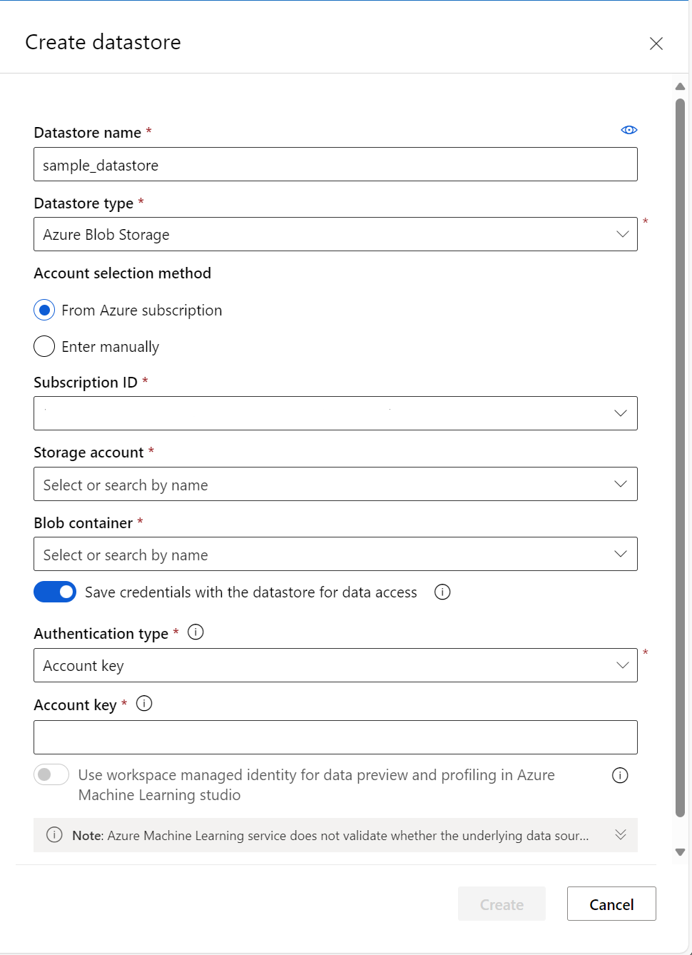 - 完成表单以创建和注册新的数据存储。 该表单会根据你选择的 Azure 存储类型和身份验证类型智能地进行更新。 有关在何处查找填充此表单所需的身份验证凭据的详细信息,请访问本文档的 存储访问权限和权限部分 。