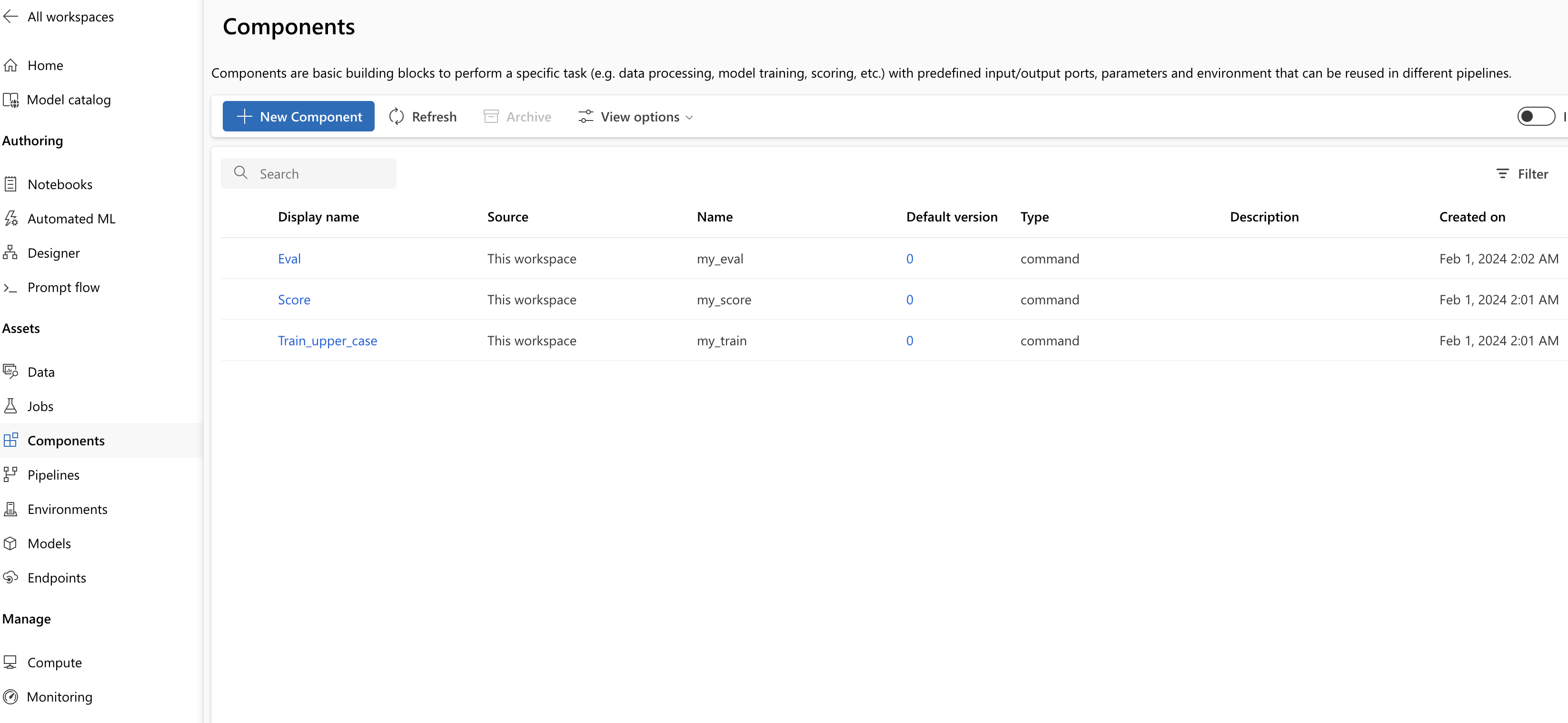 若要使用 UI 中的组件生成管道,需要先将组件注册到工作区。 可以使用 UI、CLI 或 SDK 将组件注册到工作区,以便在工作区内共享和重用组件。 已注册的组件支持自动版本控制,因此你可以更新组件,但要确保需使用较旧版本的管道能够继续工作。