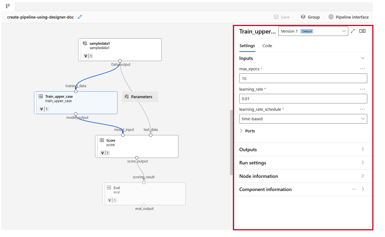还可以在右窗格中更改输出设置(存储组件输出的位置),和运行设置(用于运行此组件的计算目标)。