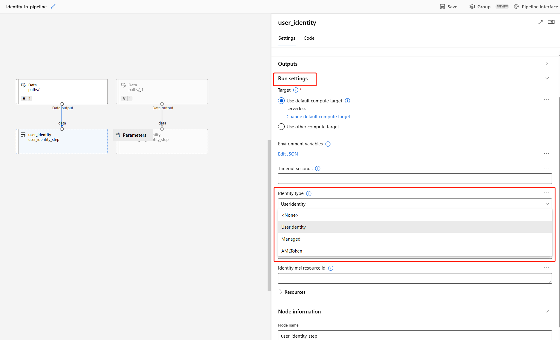 在运行时设置中,可以配置管道的默认数据存储和默认计算。 它是管道中所有组件的默认数据存储/计算。 但请注意,如果显式为组件设置不同的计算或数据存储,系统将遵循组件级别设置。 否则,它使用管道默认值。