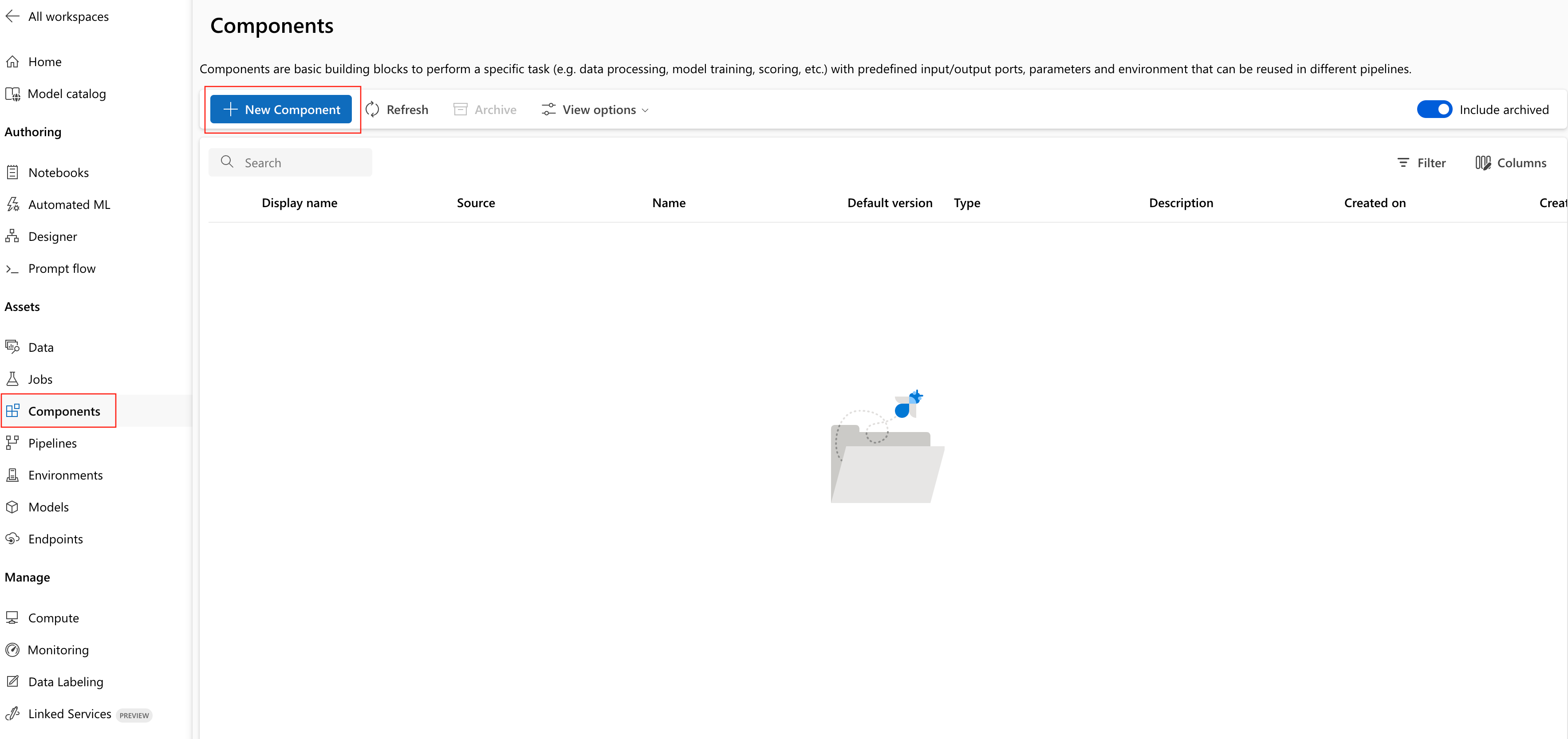 - 在 Azure 机器学习工作区中,导航到“组件”页并选择“新建组件”(将显示两个样式页之一)。