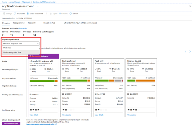 查看“ 概述 ”页,获取评估的工作负载和不同迁移路径的摘要。 可以检查根据迁移首选项选择的建议迁移路径。
