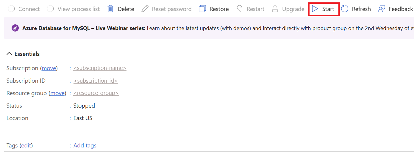 在 Azure 门户中,选择你要启动的 Azure Database for MySQL 灵活服务器实例。