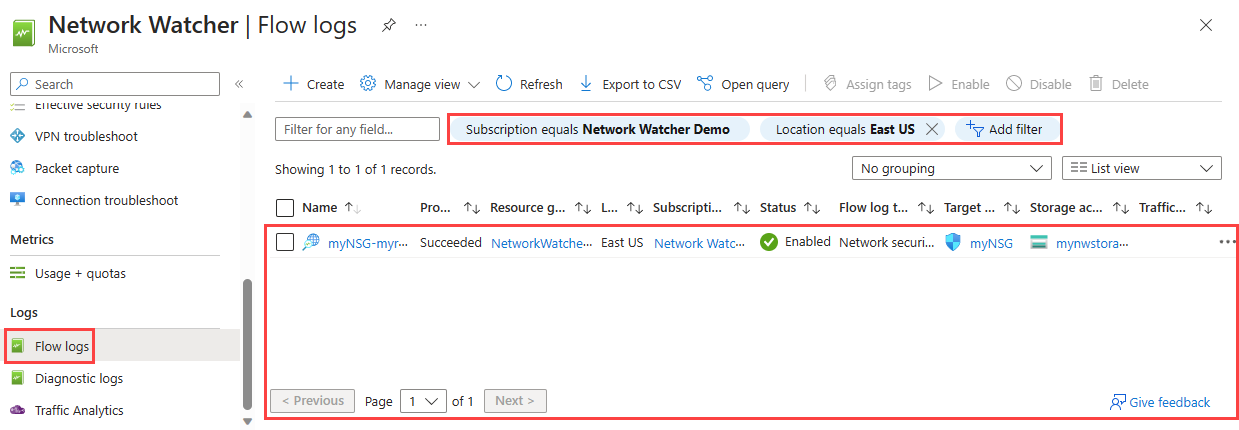 可以列出一个订阅或一组订阅中的所有流日志(Azure 门户)。 还可以列出某个区域中的所有流日志。