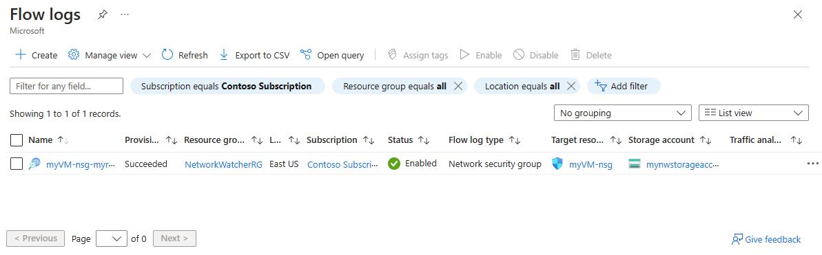 部署完成后,选择“转到资源”,确认流日志已创建并列在“流日志”页中。