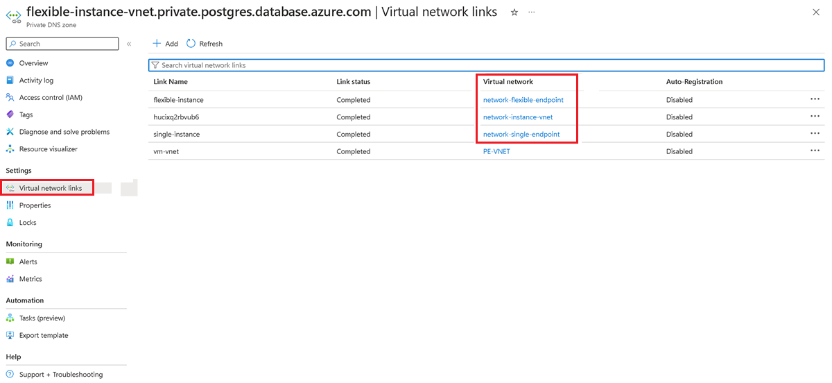 If a private DNS zone is in use, go to the private DNS zone in the portal. On the left pane, select Virtual network links and check whether the virtual network of the single server and the flexible server appears in this list.
