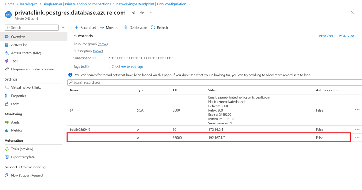 For a final check, go the private DNS zone of the private endpoint on your single server and check whether an A record is set for your single server that points a private IP address.
