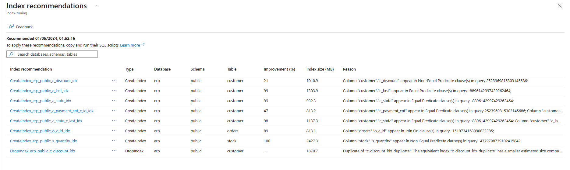 在 recommendations 视图上执行查询,以检索由索引调优生成的关于 CREATE INDEX 和 DROP INDEX 的建议。
