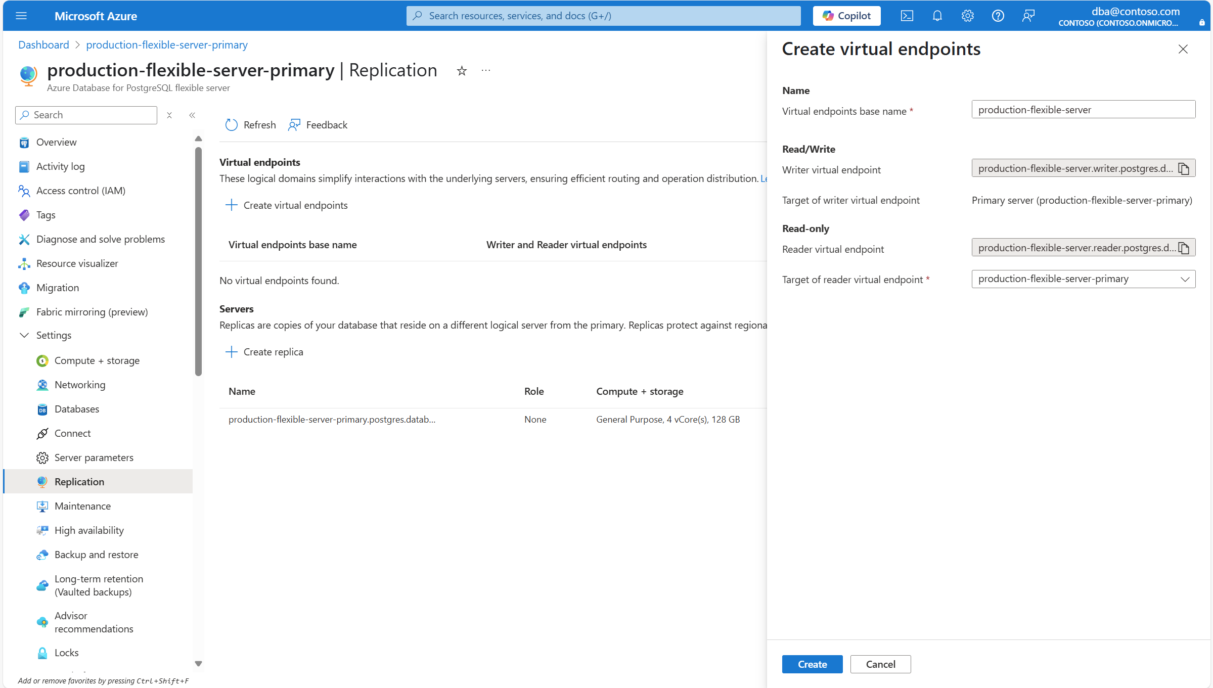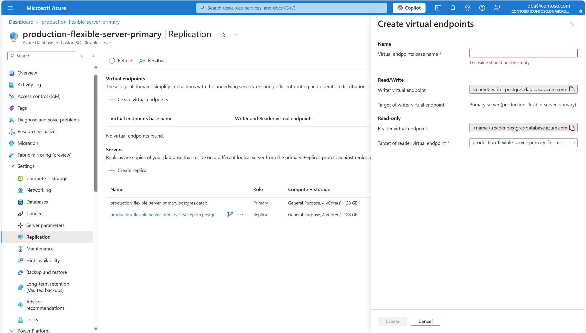 <virtual-endpoints-base-name>.writer.postgres.database.chinacloudapi.cn和<virtual-endpoints-base-name>.reader.postgres.database.chinacloudapi.cn。 在“ 创建虚拟终结点 ”对话框中的 虚拟终结点基名称中,输入一个有意义的名称,该名称尚未由其他服务器占用。编写器虚拟终结点的目标 必须始终指向主服务器,因为这是唯一配置为支持用户启动写操作的服务器。 如果要创建虚拟终结点的服务器没有任何只读副本,则 读取器虚拟终结点的目标 也指向主服务器。 但是,如果用于创建虚拟终结点的服务器有一些只读副本,则默认情况下,读取虚拟终结点的目标会指向其中一个只读副本,并且可以更改为指向主服务器或其他任何一个只读副本,前提是有多个副本。