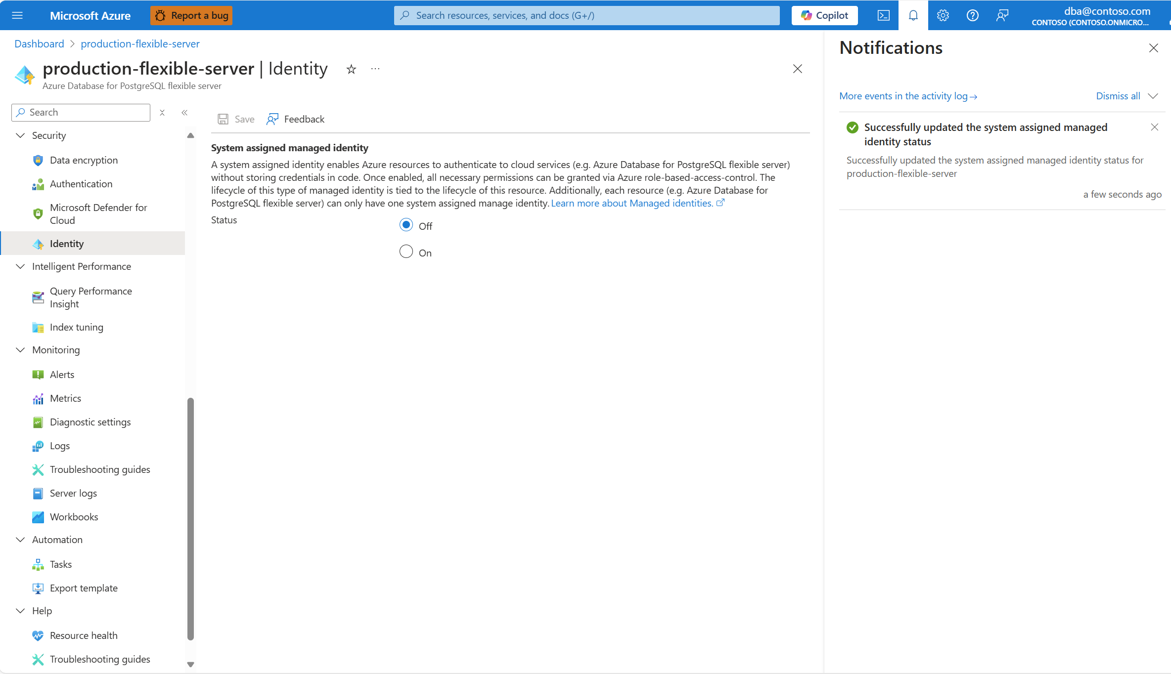 该过程完成后,一个通知会通知你系统分配的托管标识已启用。