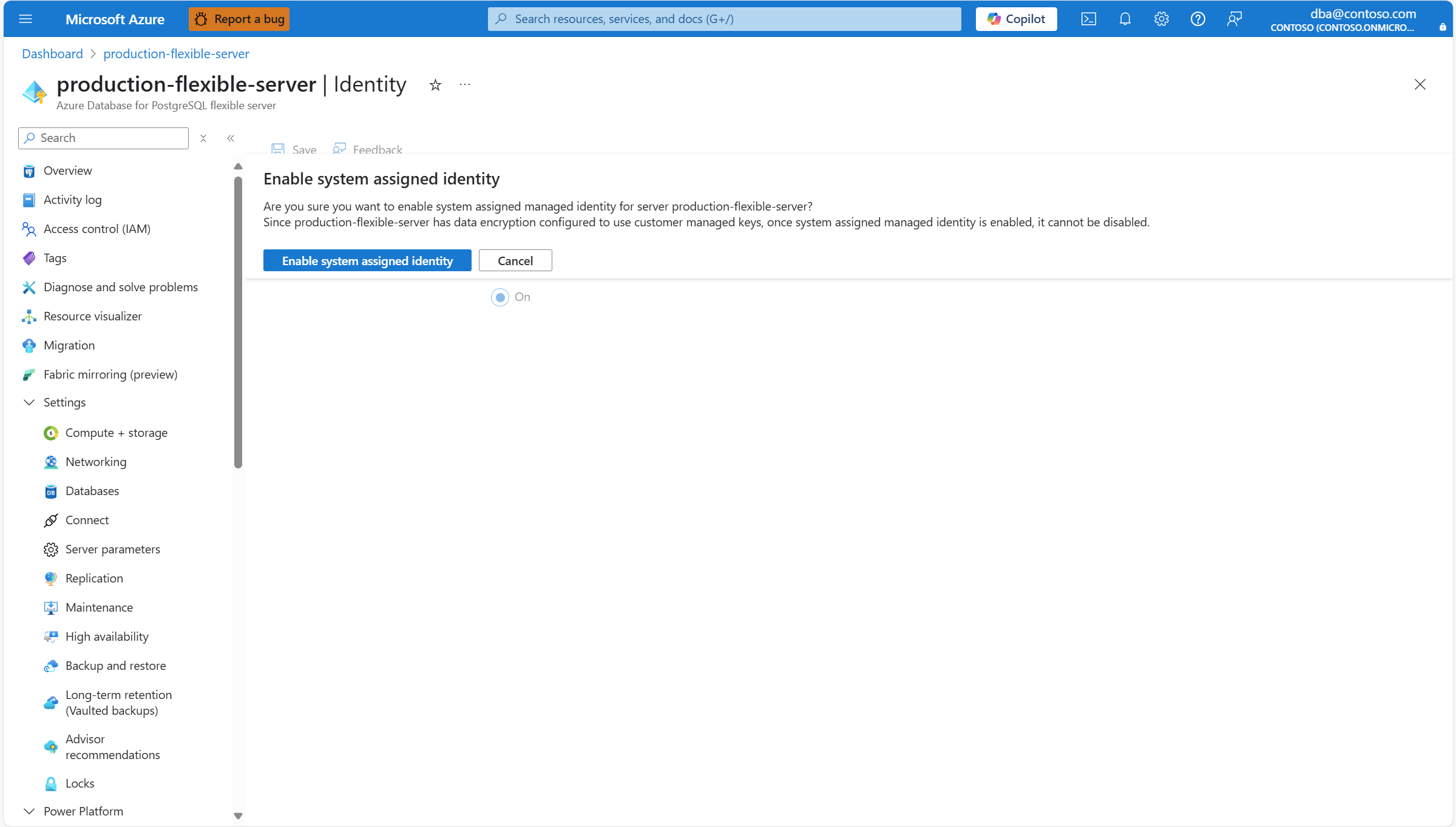 如果服务器的数据加密配置为使用客户管理的密钥,则在启用服务器的系统分配托管标识后,不支持禁用该托管标识。 因此,如果检测到这种情况,将要求你确认是否要启用服务器的系统分配托管标识。