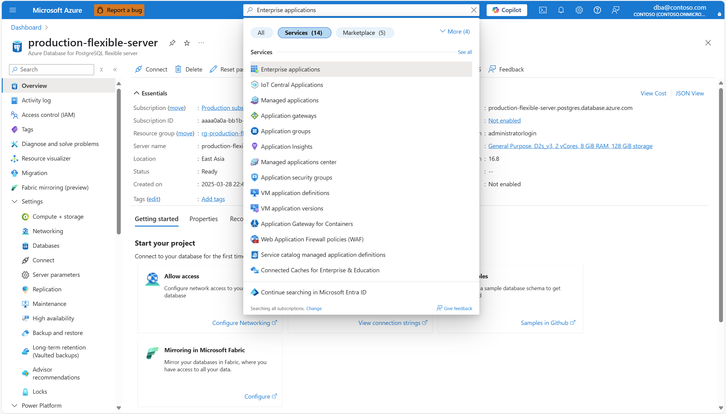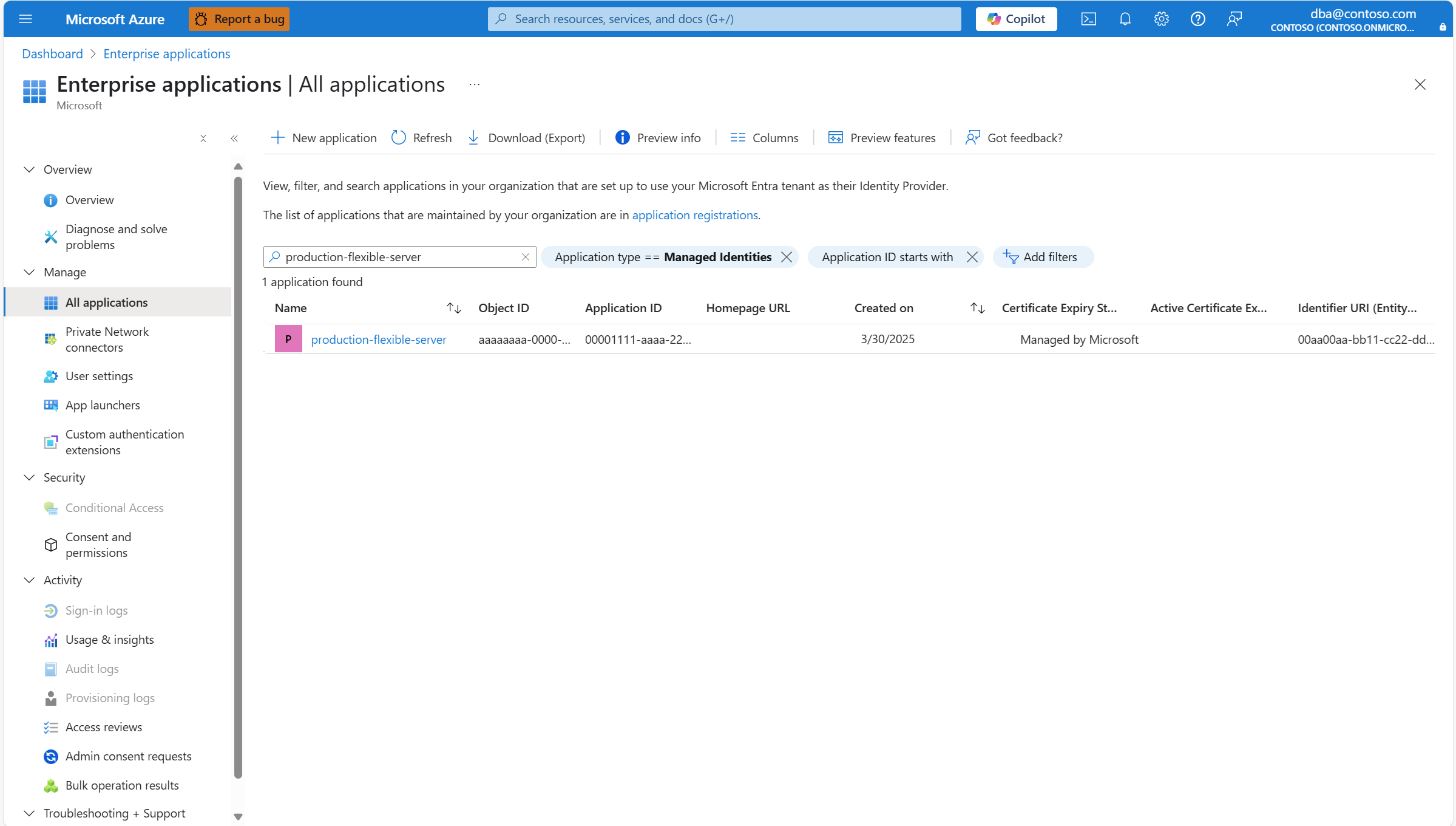 在 按应用程序名称或对象 ID 搜索 文本框中提供您的 Azure Database for PostgreSQL 灵活服务器实例的名称。